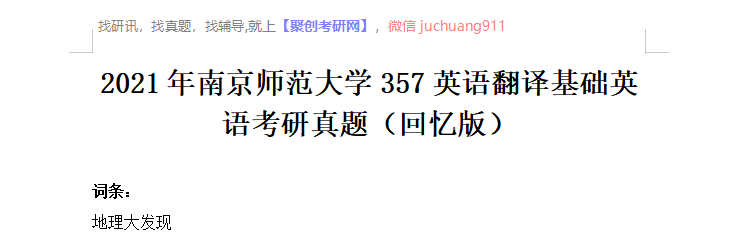 考研学习中,专业课占的分值较大。报考院校专业的考研专业课真题是专业课复习中必不可少的资料。聚创南京师范大学考研网为大家整理了2021年南京师范大学357英语翻译基础英语考研真题(回忆版),并且可以提供南京师范大学考研专业课辅导,希望考生们能够升入理想的院校。