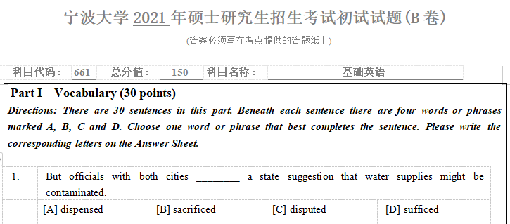 考研学习中,专业课占的分值较大。报考院校专业的考研专业课真题是专业课复习中必不可少的资料。聚创宁波大学考研小编为大家整理了2021年宁波大学661基础英语(B卷)考研真题(完整版),并且可以提供宁波大学考研专业课辅导,希望更多考生能够考上理想的院校。