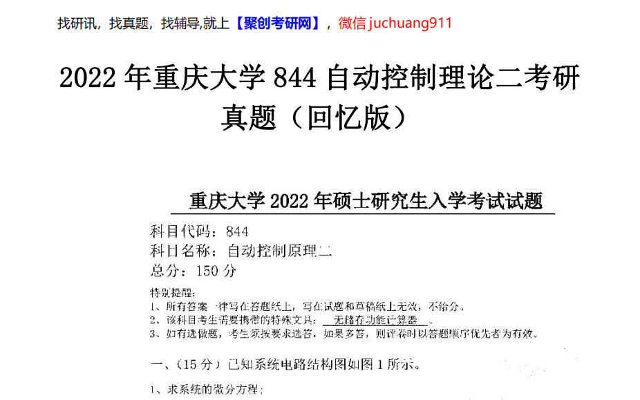 考研学习中,专业课占的分值较大。报考院校专业的考研专业课真题是专业课复习中必不可少的资料。聚创重庆大学考研小编为大家整理了2022年重庆大学844自动控制理论二考研真题(回忆版),并且可以提供重庆大学考研专业课辅导,希望更多考生能够升入理想的院校。