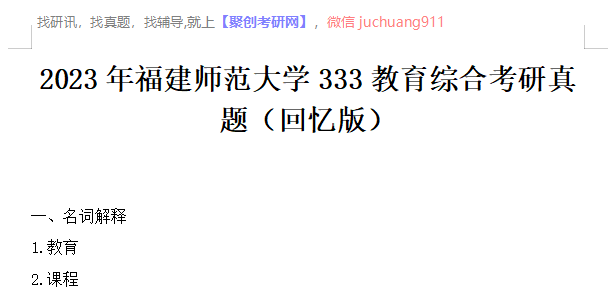 考研学习中,专业课占的分值较大。报考院校专业的考研专业课真题是专业课复习中必不可少的资料。聚创福建师范大学考研小编为大家整理了2023年福建师范大学333教育综合考研真题(回忆版),并且可以提供福建师范大学考研专业课辅导。