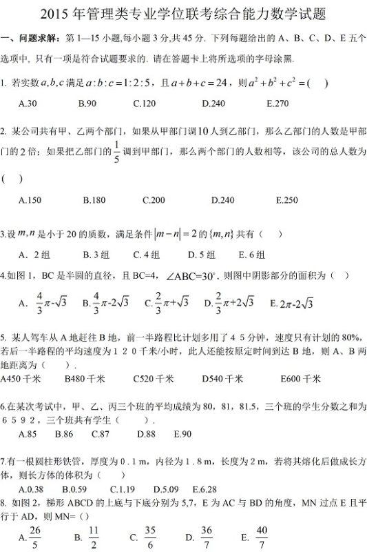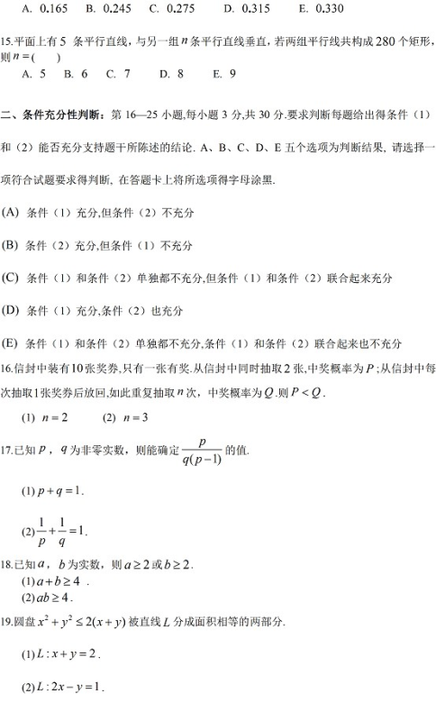以上是聚创考研网为考生整理的"2015年一月联考(MBA、MPA、MPAcc)综合能力数学真题"的相关考研信息,希望对大家考研备考有所帮助! 备考过程中如有疑问,也可以添加老师微信juchuang911进行咨询。