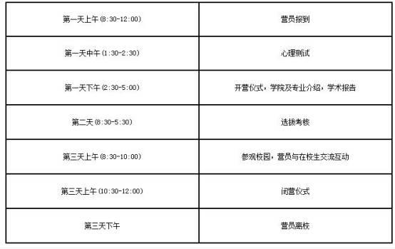 (一)综合面试:包括专业面试及心理测试,专业面试主要测试营员掌握本专业知识的情况、攻读硕士学位的目的与科研计划以及心理素质等。重在考查营员综合运用所学知识的能力、科研创新能力(专业能力倾向)以及对本学科前沿领域及最新研究动态的掌握情况等。心理测试不合格不能选为优秀营员。