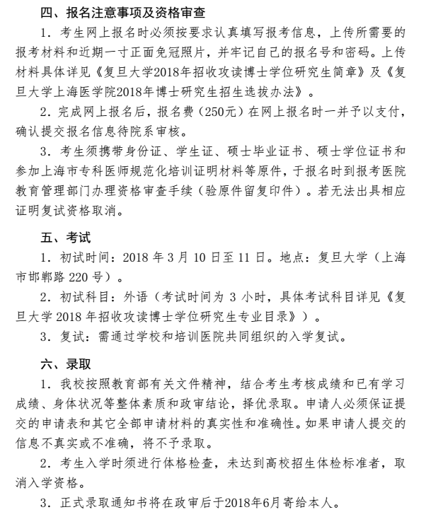 以上是聚创考研网为考生整理的"复旦大学2018年临床医学博士专业学位教育与专科医师规范化培训相结合试点项目招生简章"的相关考研信息,希望对大家考研备考有所帮助! 备考过程中如有疑问,也可以添加老师微信juchuang911进行咨询。