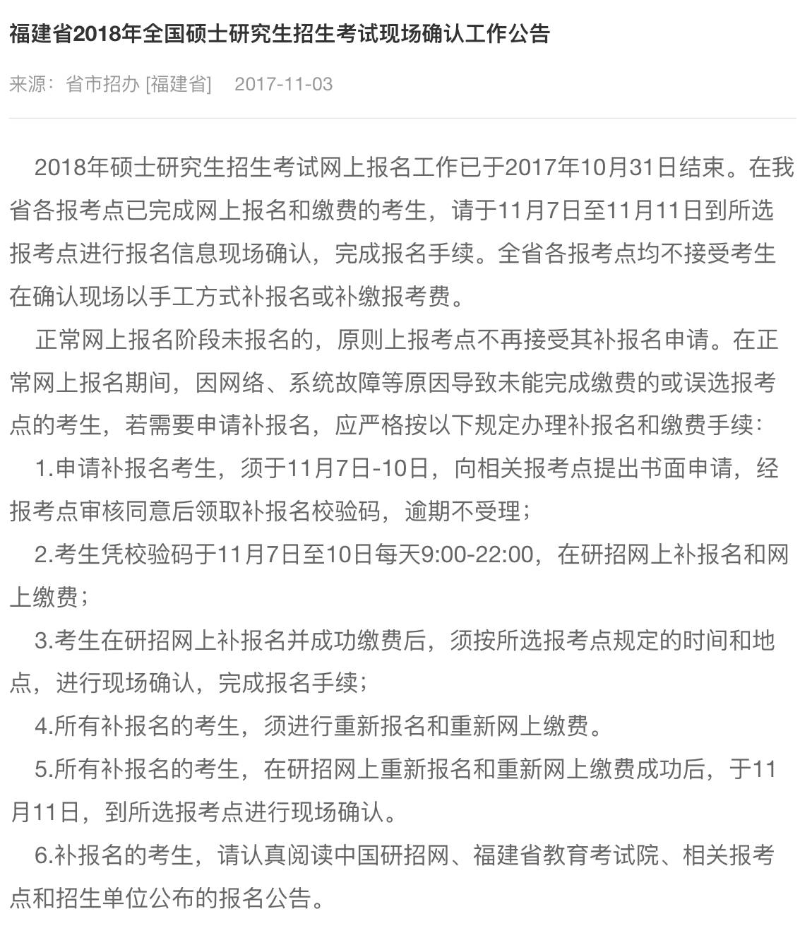 据福建省教育考试院发布的《2018年福建省全国硕士研究生招生考试现场确认工作公告》,福建省今年开通补报名,在正常网上报名期间,因网络、系统故障等原因导致未能完成缴费的或误选报考点的考生,可以申请补报名。