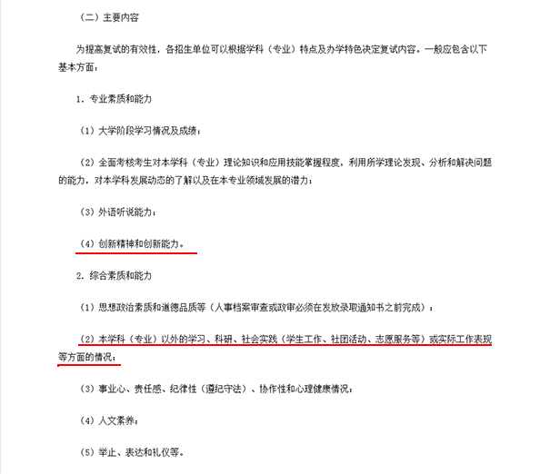 其中划红线的部分是比较容易受到院校背景影响的因素,因为科研、创新、创业等各类竞赛在名校中出现的机会通常情况下多于普通院校,这就导致二三本学生在复试中确实会存在部分劣势。如果你在学校中经常参与各类竞赛,那这种劣势也微乎其微了。