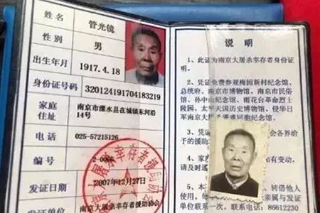 管光镜生于1917年4月,1937年亲眼目睹日军飞机来袭轰炸,他躲在溧水东河沿边大石头底下才侥幸生还。南京沦陷后,他还多次目击日军在南京郊区屠杀当地无辜百姓。