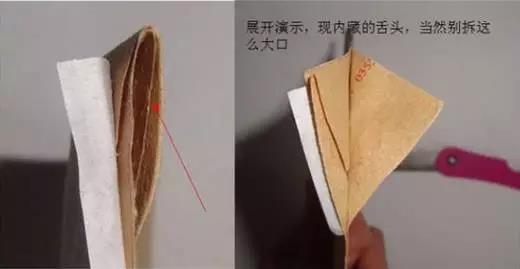 1.小心地划开侧边,紧贴最外一层开封,小刀沿上边缘划开。一定小心,不要损坏内藏的舌头,否则就没法再封口了。