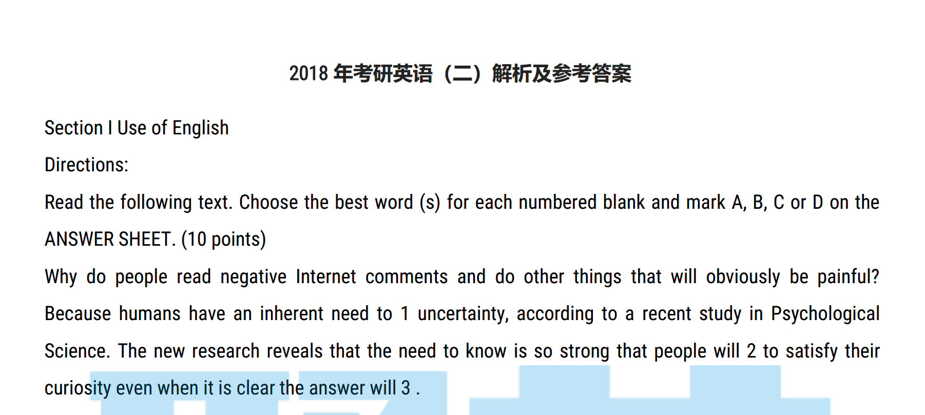 聚英考研网整理了2018年考研英语(二)真题及参考答案,部分内容如下:更多内容请下载PDF附件
