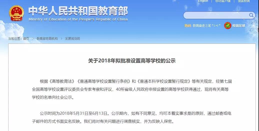 公示指出,根据《高等教育法》《普通高等学校设置暂行条例》和《普通本科学校设置暂行规定》等有关规定,经第七届全国高等学校设置评议委员会专家考察和评议,40所省级人民政府申报设置的高等学校获得通过。