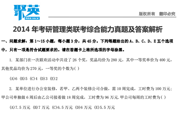 以上是聚创考研网为考生整理的"2014年考研管理类联考综合能力真题答案及解析"的相关考研信息,希望对大家考研备考有所帮助!