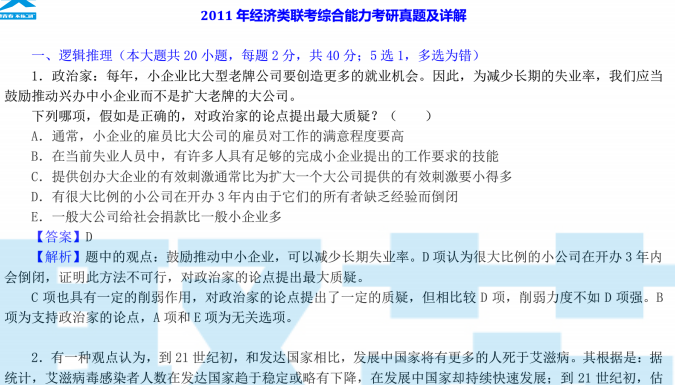 以上是聚创考研网为考生整理的"2011年考研经济类联考综合能力真题答案及解析(逻辑+数学部分+写作)"的相关考研信息,希望对大家考研备考有所帮助!