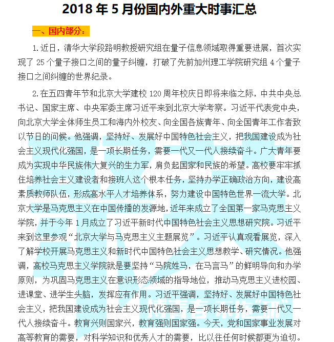 考研政治成功的秘诀之一就是:及时关注国内外的时政热点新闻,时政热点作为考研的必考点,内容多而庞杂,为了节省小伙们的政治备考时间,聚英考研信息网小编总结了5月份的时政热点新闻,并在文章末尾有完整版附件可下载。