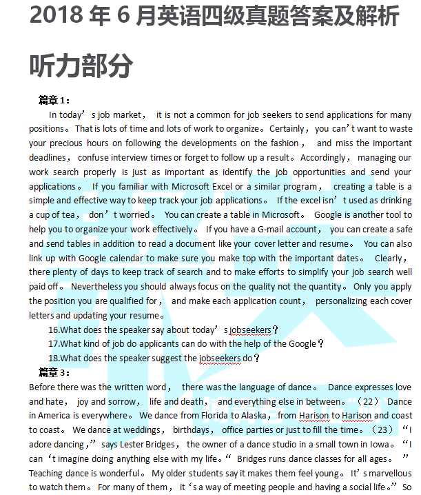 聚英考研信息网整理了2018年6月英语四级真题答案及解析(听力+翻译+阅读+完形填空),部分内容如下:更多内容请下载PDF附件