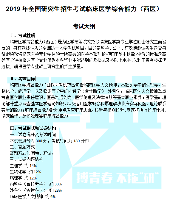 以上是聚创考研网为考生整理的"2019年西医综合考研大纲原文内容"的相关考研信息,希望对大家考研备考有所帮助! 备考过程中如有疑问,也可以添加老师微信juchuang911进行咨询。