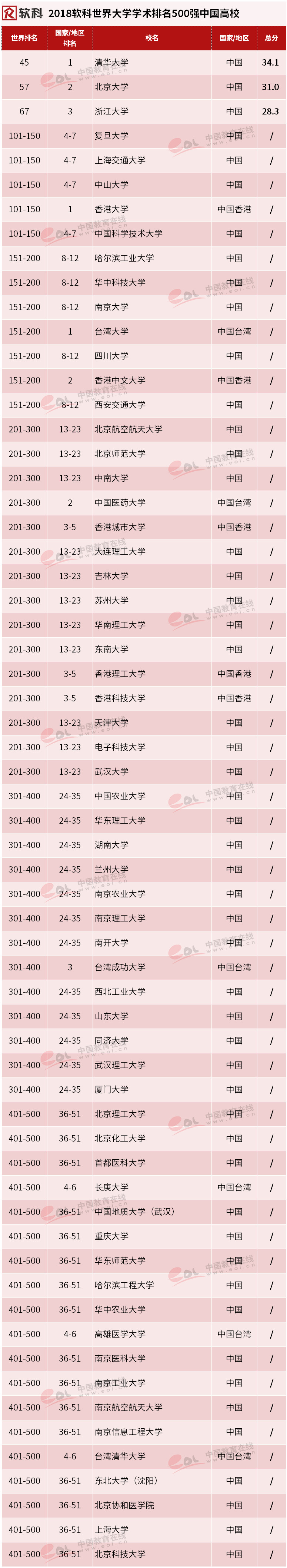 榜单中,清华大学排名世界第45,北京大学位居世界第57,浙江大学首次跻身世界百强,西北工业大学、北京理工大学、重庆大学、南京工业大学、南京信息工程大学、上海大学、北京科技大学7所大学首次跻身世界500强,显示了中国大学快速提升的学术水平和国际影响力。