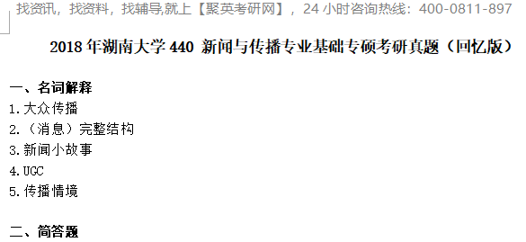 聚英湖南大学考研网整理了2018年湖南大学440新闻与传播专业基础专硕考研真题(回忆版),部分内容如下: