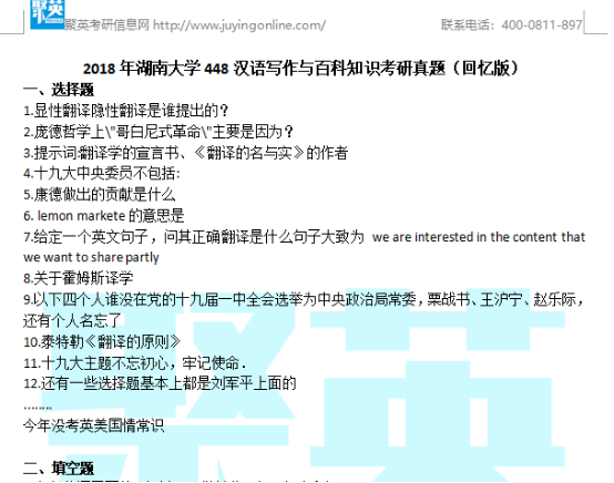 聚英湖南大学考研网整理了2018年湖南大学448汉语写作与百科知识考研真题(回忆版),部分内容如下: