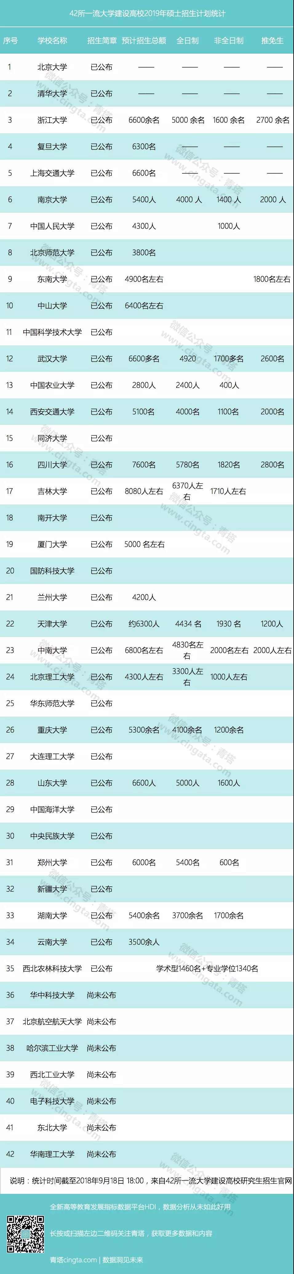 再有一周左右,2019年硕士研究生考试的预报名就要开始了。近日,42所一流大学建设高校中除少数几所高校,都相继公布了2019年硕士生招生简章,其中部分高校还公布了2019年招生总数、全日制硕士生招生数、非全日制招生数和推荐免试生的预计招生数,跟着聚英考研信息网小编一起来看看。