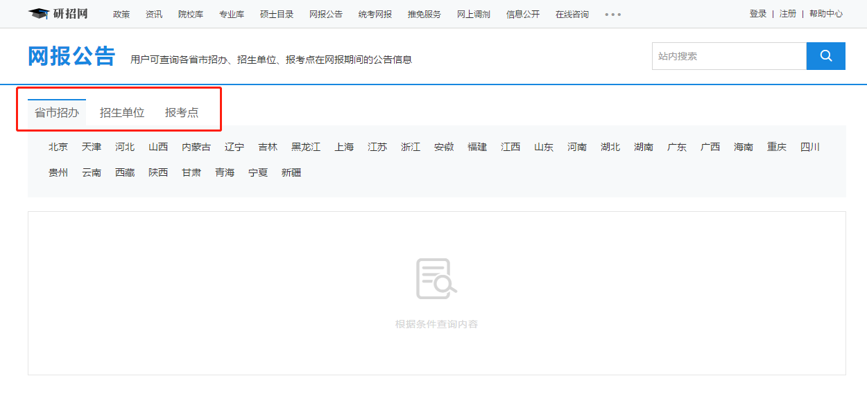 大家可点击研招网首页中的【网报公告】栏目进入,查看自己所属的省份公告信息,以免错过信息。