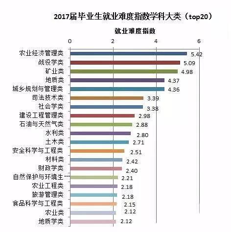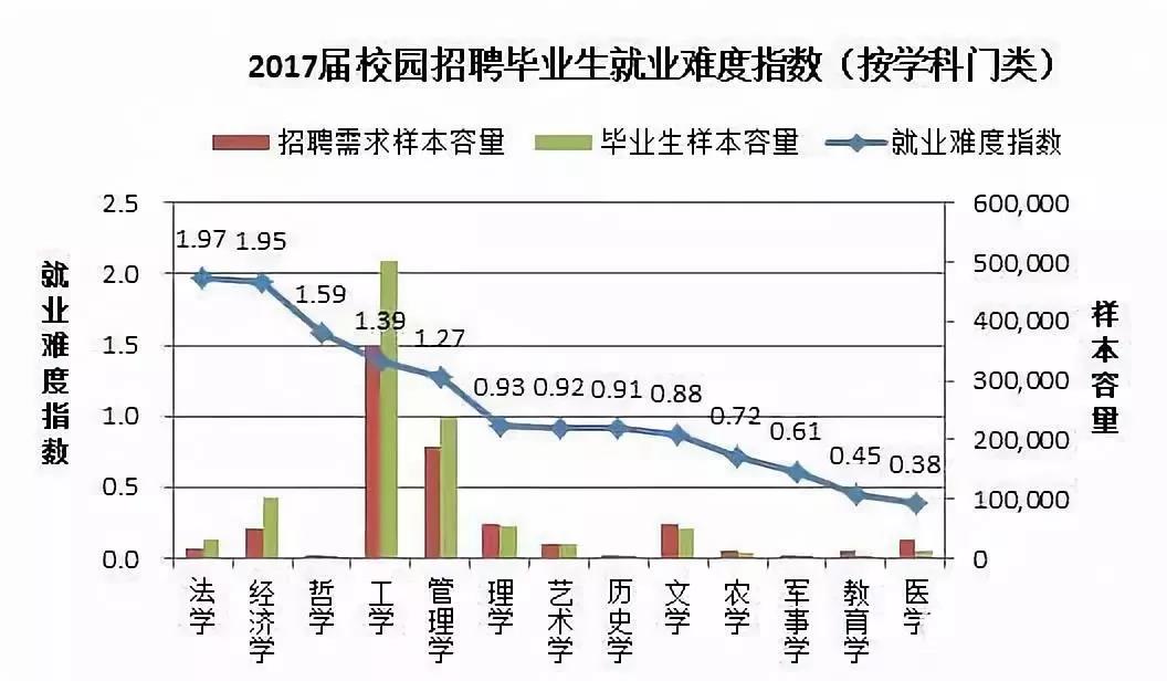 如图所示,2017届校园招聘毕业生就业难度指数(毕业生样本容量/招聘需求样本容量)按学科门类看,法学就业难度指数最大,其次是经济学和哲学。