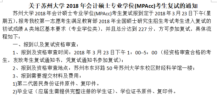 据悉,关于苏州大学2018年商学院会计硕士专业学位(MPAcc)考生复试的通知已公布, 聚英苏州大学考研网小编为大家整理内容如下: