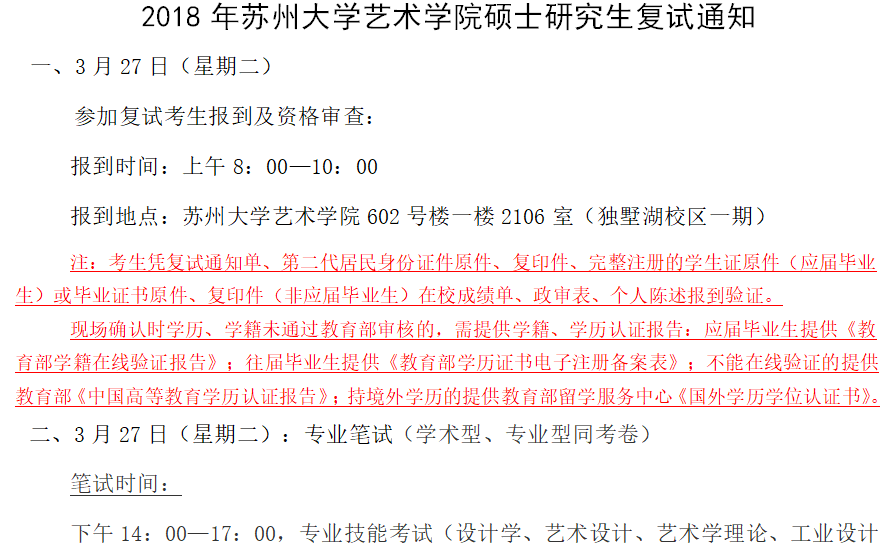 据悉,2018年苏州大学艺术学院硕士研究生复试通知已经公布,聚英苏州大学考研网为您整理如下: