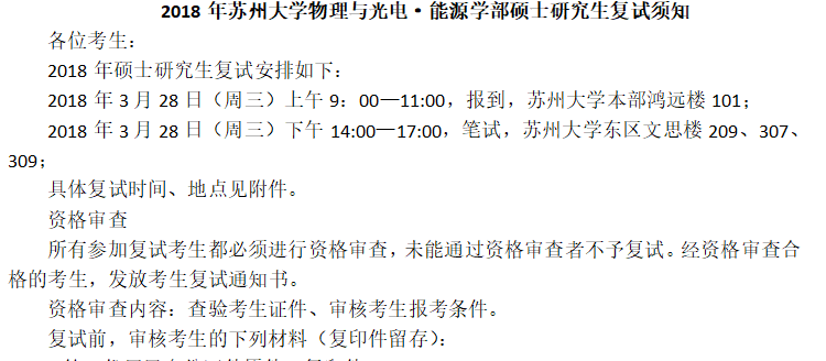 据悉,2018年苏州大学物理与光电·能源学部硕士研究生复试须知已经公布,聚英苏州大学考研网为您整理如下: