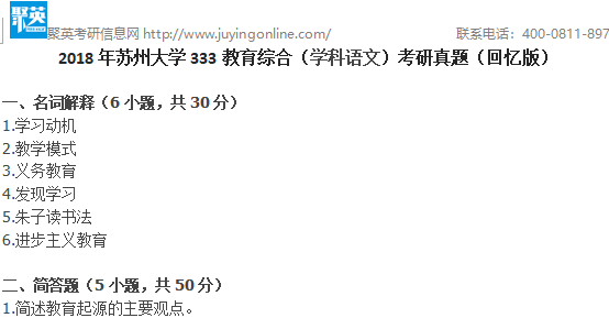 聚英苏州大学考研网整理了2018年苏州大学333教育综合(学科语文)考研真题(回忆版),部分内容如下: