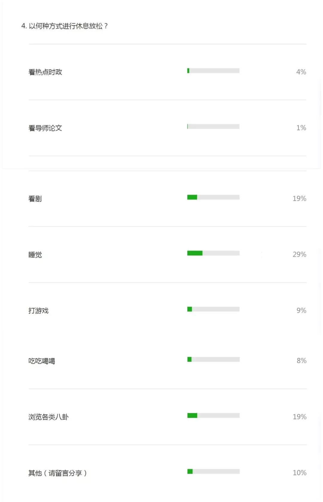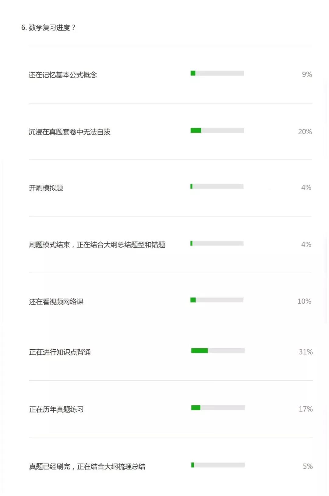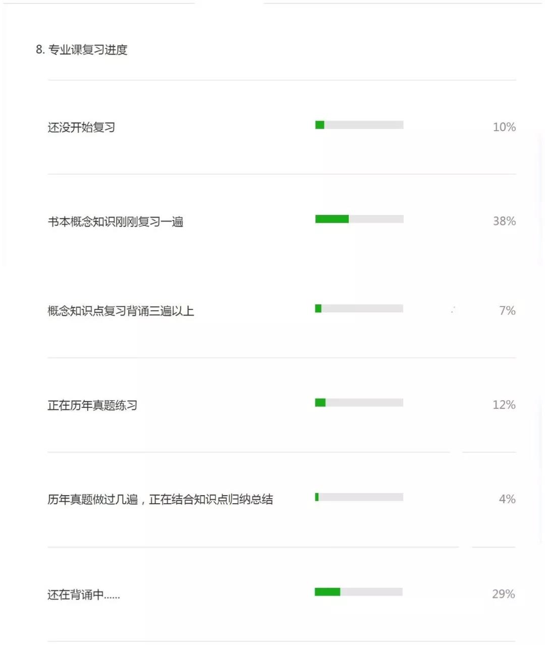 由上图我们可以看出有一半的同学都已经开始接触各类题型了,也是正常的复习进度。也有11%的同学开始准备写作了,如果是19考研的同学单词一遍还没有看完,后面复习的压力会很大。这个阶段建议英语每天复习时间为两小时以上,每周选择一个下午严格按照考试的时间,甚至应该提前十分钟完成,做完之后对答案,注意总结每道题目的思路和考点。每天还应补充一定量的真题练习,阅读可以选择每天一篇,完形、翻译、新题型差开来练习,每周也应各练习两次。