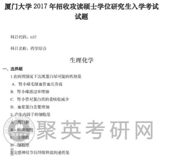 以上是聚创厦大考研网为考生整理的"2017年厦门大学637药学综合考研真题(回忆版)"的相关考研信息,希望对大家考研备考有所帮助! 备考过程中如有疑问,也可以添加老师微信juchuang911进行咨询。