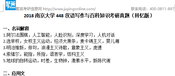以上是聚创考研网为考生整理的"2018南京大学448汉语写作与百科知识考研真题(回忆版)"的相关考研信息,希望对大家考研备考有所帮助!