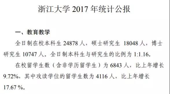 据学校官网2017年的数据统计报告显示,浙江大学2017年硕士研究生 18048 人,博士研究生 10747 人,总计约2.8万人左右。截至2017年12月,浙大拥有博士学位授权二级学科274个(含自主增设54个),博士学位授权一级学科54个;硕士学位授权二级学科309个(含自主增设56个),硕士学位授权一级学科62个,18个学科入选国家一流建设学科,居全国高校第三。