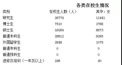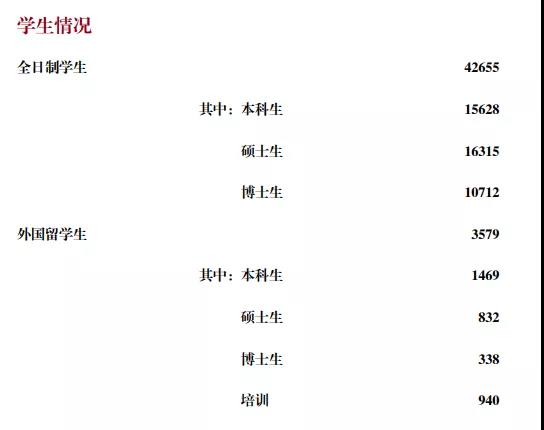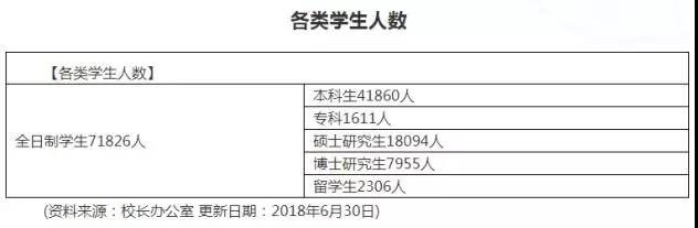 (数据截至2017年12月31日)学校现有全日制普通本科生3.7万余人,硕博士研究生2万余人,外国留学生及港澳台学生3700余人。学校现有博士学位授权一级学科45个,专业学位授权点32个,本科专业142个,博士后流动站37个,国家重点学科46个,国家重点培育学科4个,是国家首批工程博士培养单位。截至2017年底,学校进入ESI排名全球前1%的学科领域14个,其中,化学、材料科学学科领域进入全球前1‰。