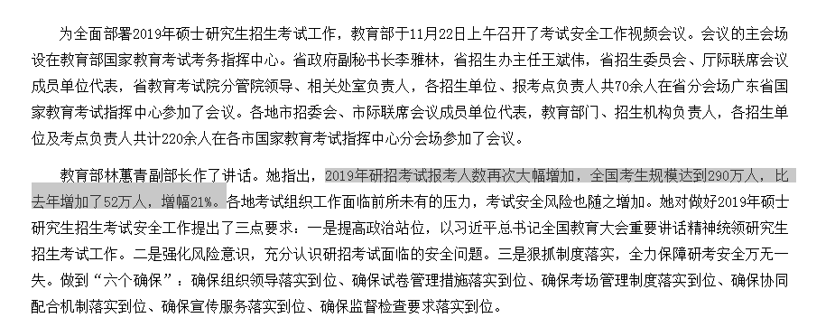 聚英聚创考研网讯:网传2019年网报人数超285万,相信大家对于285万这个数字都已经听到耳朵都磨出茧子了。之前各种版本的数据,说2019年考研报考人数达285万,一直没有官方的说法。今天小编在查找资料的时候,意外在广东省教育考试院官网发现一个重磅的消息,实锤:在教育部11月22日召开的2019年硕士研究生招生考试工作安全工作视频会议上,教育部副部长林蕙青指出,2019年研招考试报考人数再次大幅增加,全国考生规模达到290万人,比去年增加了52万人,增幅21%。