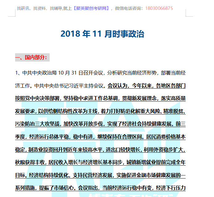 考研政治成功的秘诀之一就是:及时关注国内外的时政热点新闻,时政热点作为考研的必考点,内容多而庞杂,为了节省小伙们的政治备考时间,聚英聚创考研信息网小编总结了11月份的时政热点新闻,并在文章末尾有完整版附件可下载