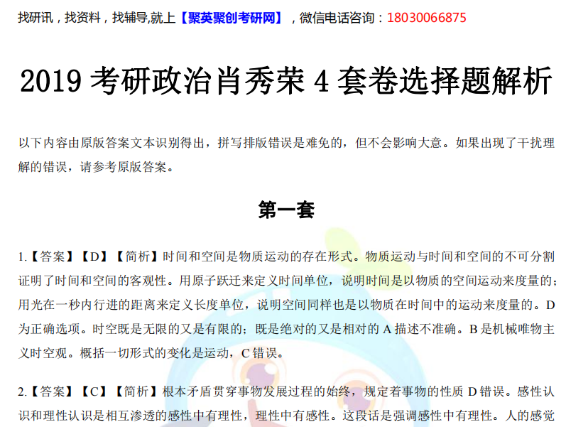 千呼万唤始出来,肖4正版书籍的增值服务答案解析终于出来啦。考研的小伙伴们是不是很开心很激动,额,问题来了,这个限制只能在APP上看,而且都不能复制文字,这多不方便啊~不用担心,聚英聚创考研信息网小编为大家整理了清晰的Word版本,以便小伙伴们可以下载打印纸质版,更好的查看复习哦!