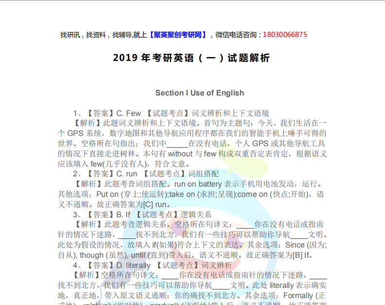以上是聚创考研网为考生整理的"2019年考研英语(一)真题解析下载"的相关考研信息,希望对大家考研备考有所帮助! 备考过程中如有疑问,也可以添加老师微信juchuang911进行咨询。