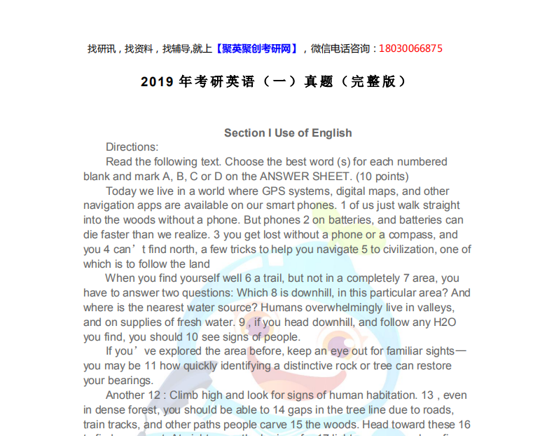 以上是聚创考研网为考生整理的"2019年考研英语(一)真题及答案解析完整版下载"的相关考研信息,希望对大家考研备考有所帮助! 备考过程中如有疑问,也可以添加老师微信juchuang911进行咨询。