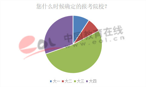 根据中国教育在线调查,超过50%考生在大三确定考研报考的院校,在大四确定院校的占30%,大一和大二确定的占9%和8%左右。