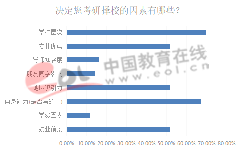 从考研择校的因素来看,学校层次是考生首要考虑的择校因素,其次考虑的是自身能力,第三则是专业优势、地域吸引力和就业前景。
