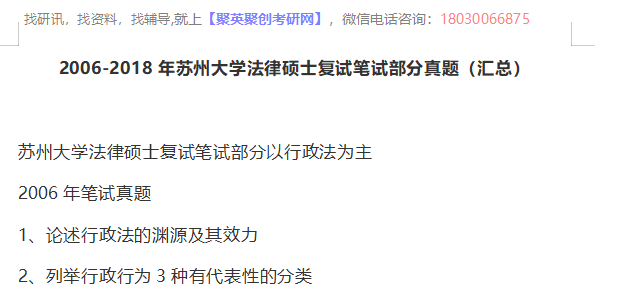 以上是聚创考研网为考生整理的"2006-2018年苏州大学法律硕士复试笔试部分真题(汇总)"的相关考研信息,希望对大家考研备考有所帮助! 备考过程中如有疑问,也可以添加老师微信juchuang911进行咨询。
