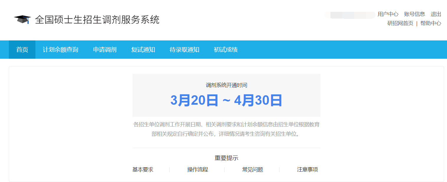 考生需认真阅读各招生单位在其院校信息栏目里及其它途径公布的调剂办法,打开研招网(http://yz.chsi.com.cn/)首页后,用学信网账号登录调剂系统后,查询各招生单位的专业计划余额信息,特别要留意招生单位的调剂申请条件。