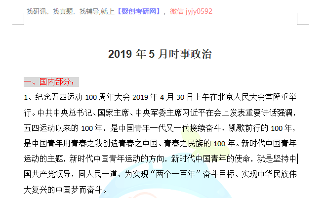 考研政治成功的秘诀之一就是:及时关注国内外的时政热点新闻,时政热点作为考研的必考点,内容多而庞杂,为了节省小伙们的政治备考时间,聚创考研信息网小编总结了5月份的时政热点新闻,并在文章末尾有完整版附件可下载。
