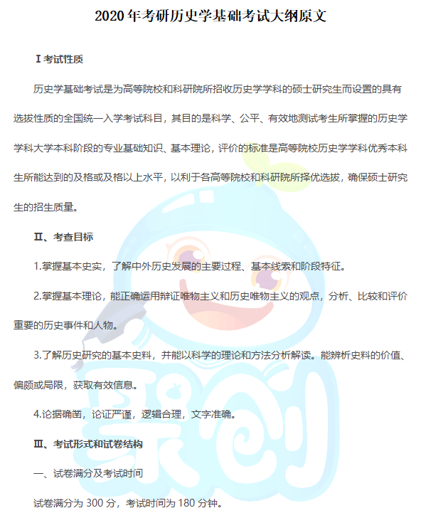 以上是聚创考研网为考生整理的"2020年考研历史学基础考试大纲原文内容"的相关考研信息,希望对大家考研备考有所帮助! 备考过程中如有疑问,也可以添加老师微信juchuang911进行咨询。