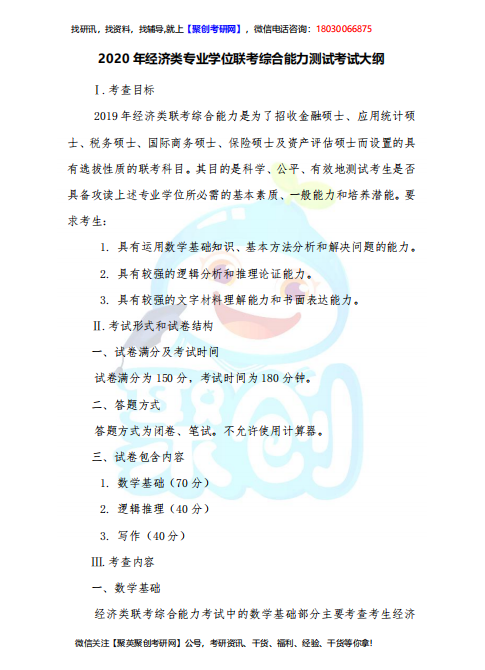 据悉,2020年经济类专业学位联考综合能力测试考试大纲已公布,聚创考研信息网小编为大家整理如下: