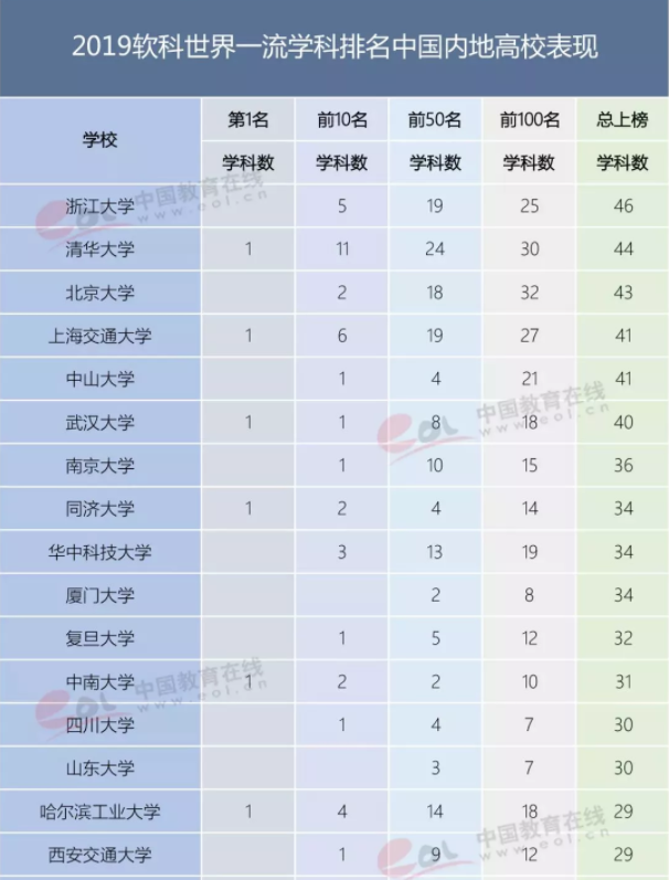 下面是2019软科世界一流学科排名中国内地高校表现: