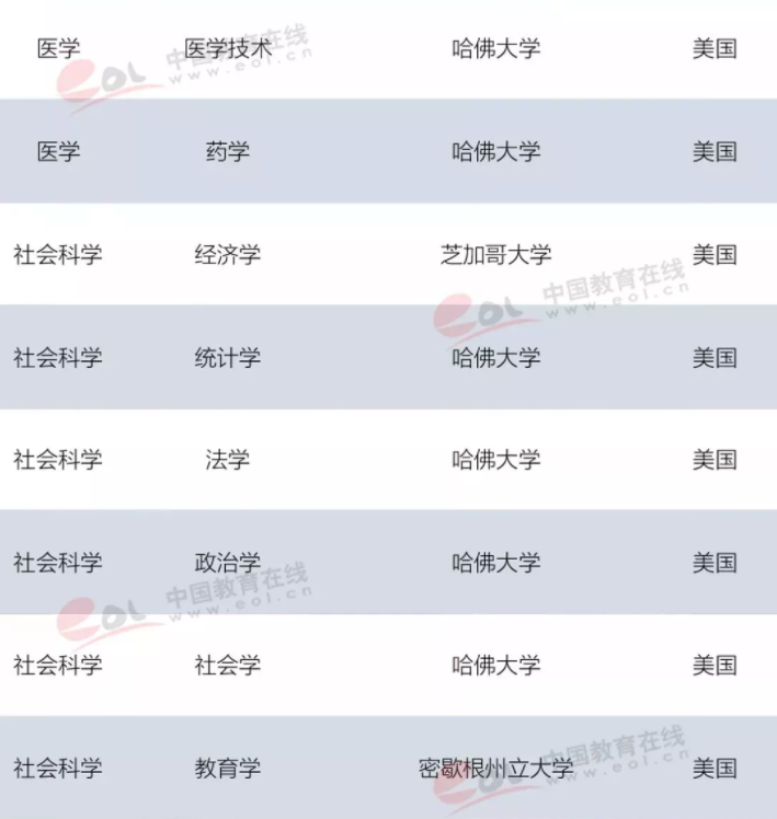 美国大学在各学科排名上仍然占据绝对优势,在35个学科中夺冠,上榜总次数达到4808次,其中哈佛大学占据14个学科榜首。