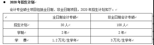 2020计划招生全日制会计硕士30人,学制2年,学费1.2万/年;非全日制100人,学制2年,学费3万/年。