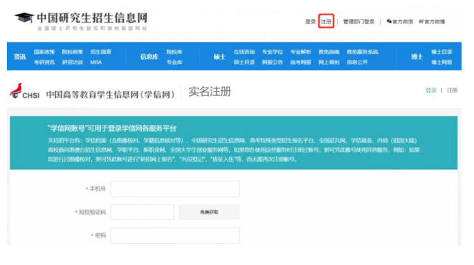 注册学信网账号流程总体比较简单:打开研招网→点击“注册”,会自动跳转到学信网注册系统,填写手机号码、身份证号、邮箱信息注册即可。