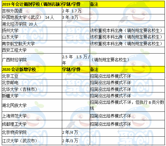 下面表格是聚创考研信息网整理的2019年会计有调剂名额的学校和2020年会计新增的学校,供同学们参考。